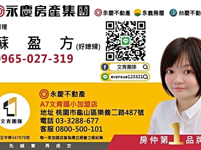 ❻ 開車約1.3公里 約3分鐘到A7捷運站 約|交通四通八達,雙北輕鬆串聯---------------------------------------------- ⭐️聯繫資訊⭐️ 永慶不動產 - A7文青國小加盟店 ⭐️ (桃園市龜山區樂善二路487號)蘇盈方 0965027319 +我的LINE Line Id: evansue123321------------------------------------------------ ⭐️團隊資訊🌏 專營A7 A8 A9 林口 大台北地區⭐️ 買賣繼承.免費洽詢🌇 大北部房地產買賣免費諮詢評估🏆 菁英團隊珍惜所託我們全力以赴🎖 買賣房屋的大小事,交給最有親和力兼具專業度的 A7盈盈(好媳婦)🏘 【文青團隊❤️幸福企業】A7重劃區的好夥伴好鄰居★歡迎預約賞屋或留下您的需求🏘 經紀業: 京承不動產有限公司🏘 經紀人: 陳雅華(112)新北經字第004526號