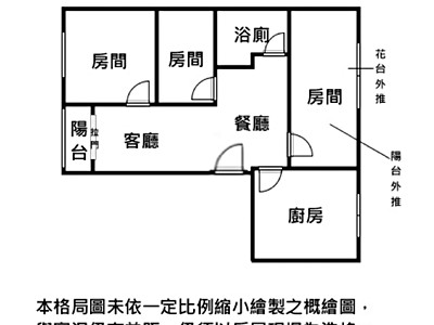 3. 本頁面若有刊登格局圖,係未依一定比例縮小繪製之概繪圖,與實況仍有差距,實際格局比例仍須以房屋現場為準。