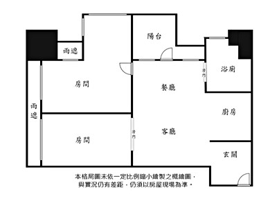 3.本頁面若有刊登格局圖,係未依一定比例縮小繪製之概繪圖,與實況仍有差距,仍須以房屋現場為準.