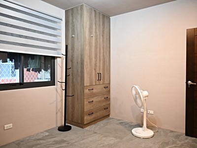 5.裝修風格採現代極簡風格,可隨自己喜愛調整牆面顏色即可改變風格,現況房間與客廳的設計調性不同,房間刷上溫暖柔和色系,櫃體採頂天立牢靠收納多,皆有對外採光。