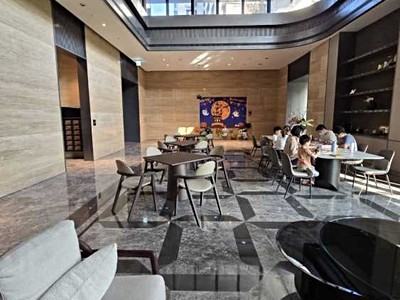 3.一樓挑高氣派豪華管理室門廳,後方中庭連接二樓公共環景步道,基地退縮設計綠意水景 綠樹穿梭大自然中 都市吵雜人車經過忍不住放慢速度想多看一眼~